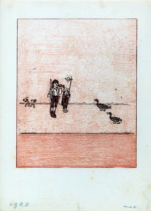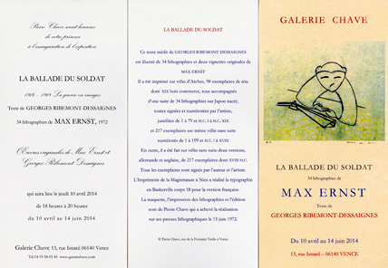 À cette occasion GRD qui, pendant toute sa vie, avait su garder son sens du dérisoire, sa passion anticonformiste et sa volonté de dénoncer, avec violence, la bêtise qui conduit aux patriotismes ou nationalismes idiots et à la guerre, montra à Max Ernst un de ses écrits auquel il tenait particulièrement : La Ballade du soldat. Max Ernst fut enthousiasmé et décida de l’illustrer.